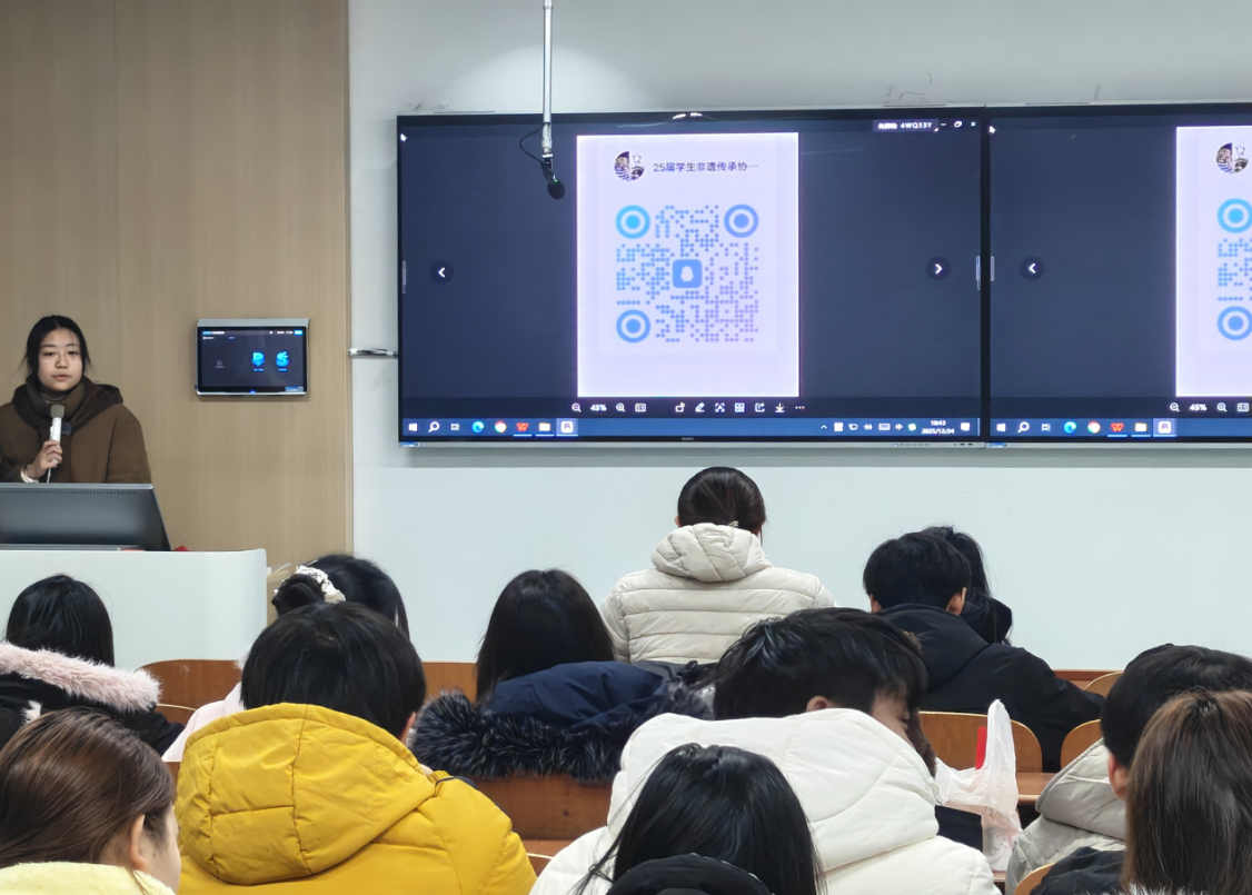 (冯钟昊翰 杨明玉/图文)为弘扬中华优秀传统文化,增强青年学子的文化自信与归属感,同时推进学生社团的组织建设与人才吸纳,非遗文化传承协会于2025年12月24日下午18:00在3212举办了2025年度社团见面会。本次活动由院团委指导,非遗协会主办,集“非遗知识讲座”“非遗灯笼制作大赛颁奖典礼”及“社团职能部门招新”于一体,内容丰富、形式多样,吸引了全校百余名师生积极参与,现场气氛热烈。 活动伊始,协会指导老师何玲玲为在场师生带来了一场题为《认识非物质文化遗产守护精神家园》的专题讲座。何老师通过生动的案例分析与实物图片展示,深入浅出地阐释了“见人、见物、见生活”的非遗保护理念,并结合湖北和十堰本地特色,重点讲解了:“山二黄”“郧阳凤凰灯舞”“武当武术”的历史渊源与艺术价值。引导同学们不仅要“看热闹”,更要“看门道”,激发了大家对传统文化的敬畏之心与传承之志。